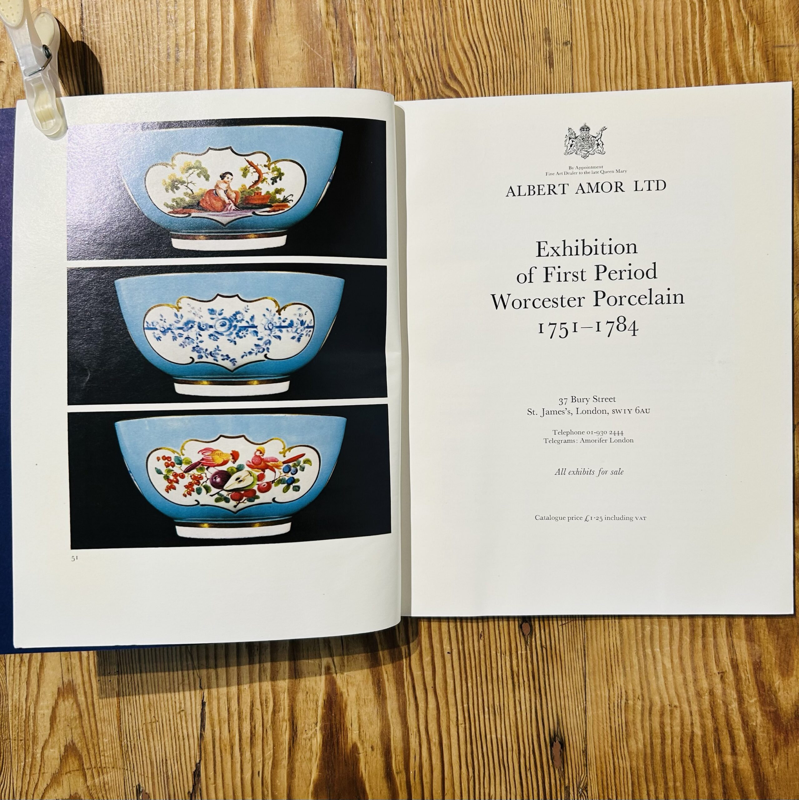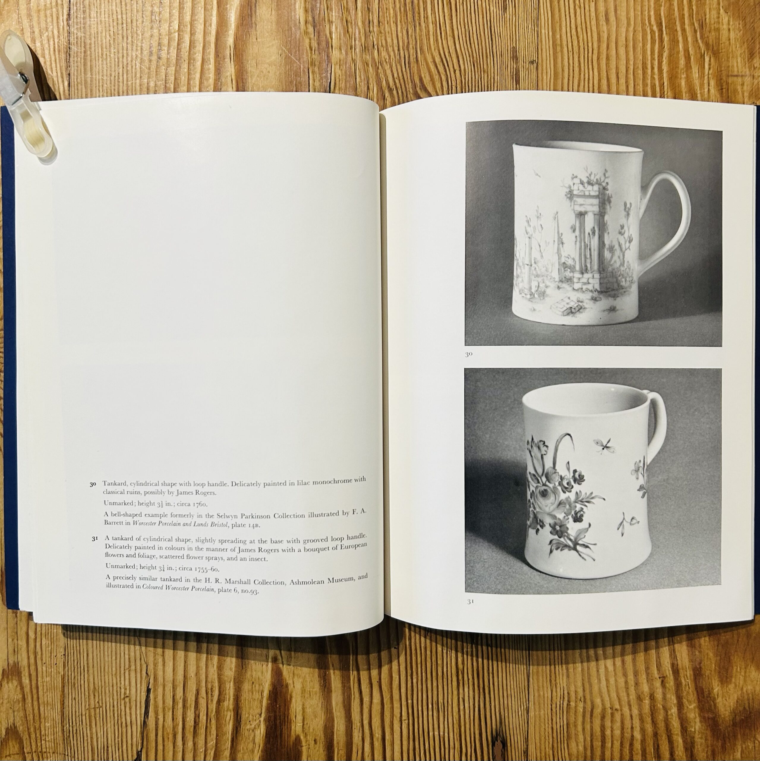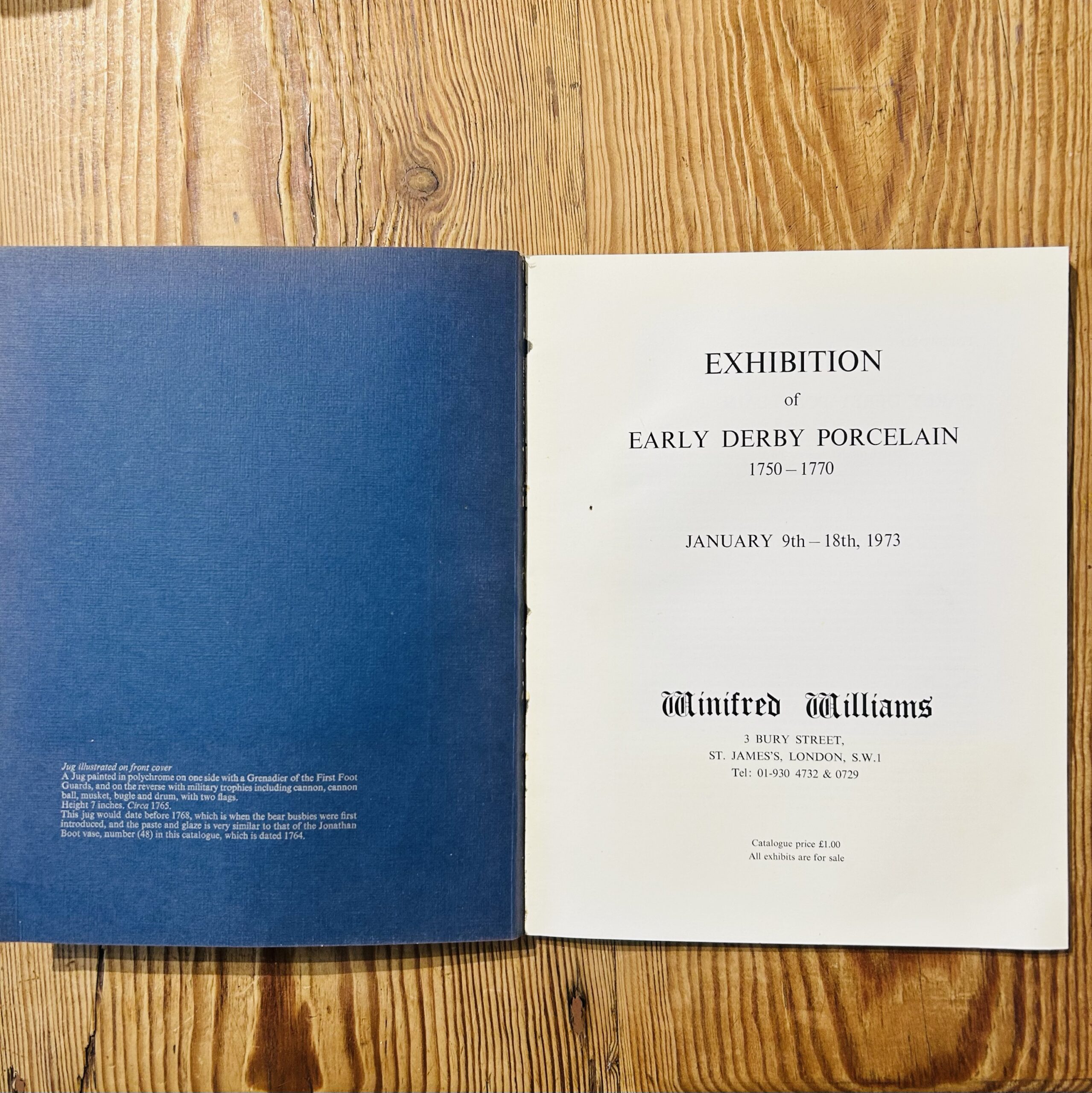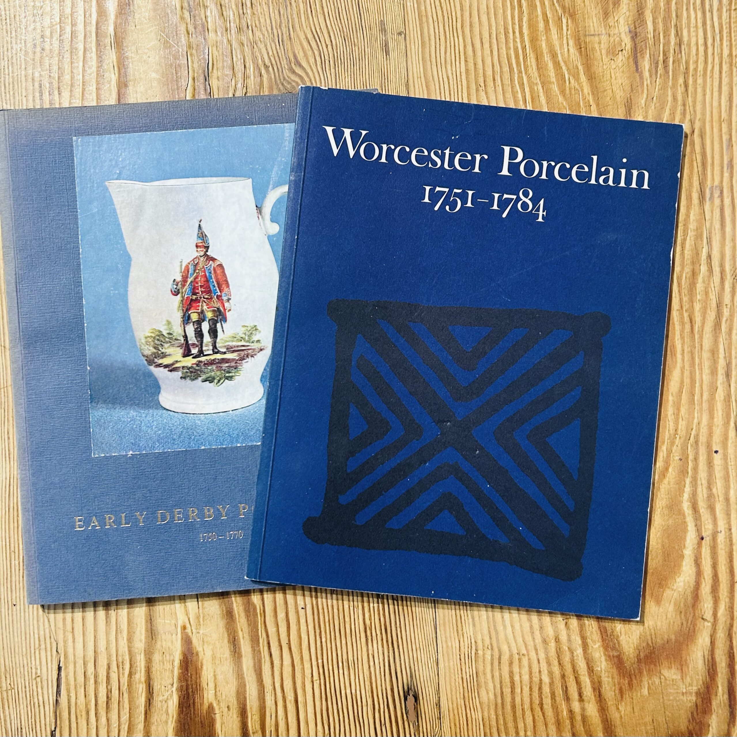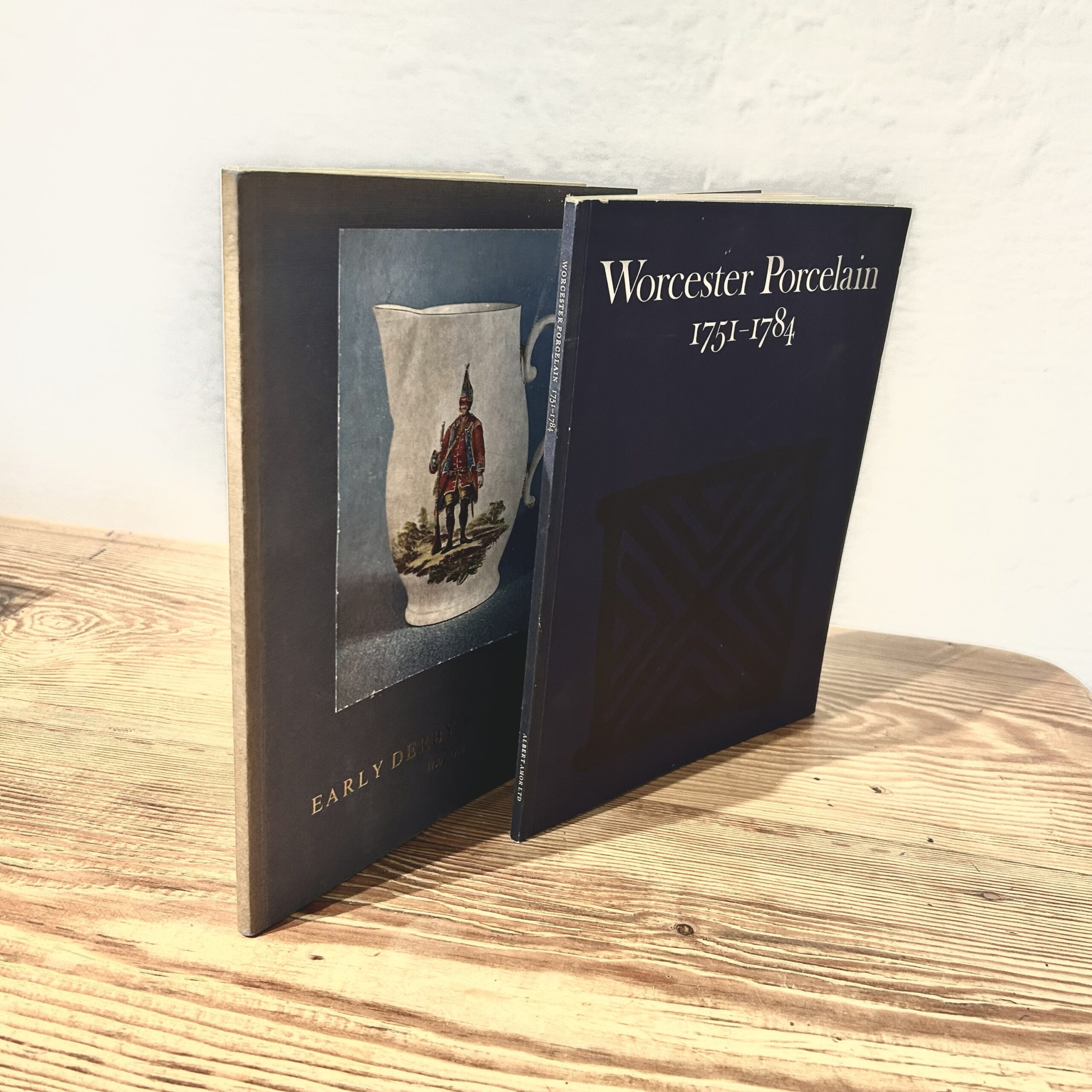 This set includes two scarce 1973 exhibition catalogues from premier London ceramic specialists Albert Amor Ltd and Winifred Williams. The Albert Amor volume, Exhibition of First Period Worcester Porcelain 1751-1784, catalogues 86 important lots including rare “Blind Earl” dishes and James Giles decorated wares. The Winifred Williams catalogue, Early Derby Porcelain 1750-1770, documents 80 significant pieces, including “dry edge” figures and “Schneeballen” manner vases. Both publications feature scholarly descriptions and black-and-white plates, serving as essential reference tools for identifying provenance and rare forms in 18th-century English soft-paste porcelain.
