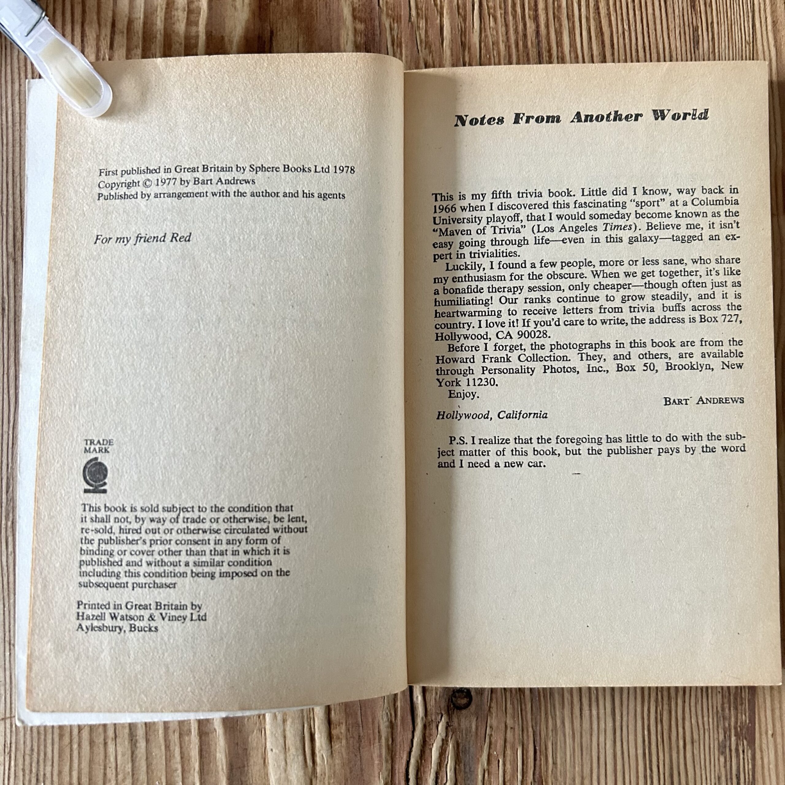 From the Blob to Star Wars is a comprehensive and nostalgic trivia collection by Bart Andrews, published by Sphere Books at the height of the late-70s space opera craze. This quiz book challenges cinema fans with hundreds of questions covering the “Golden Age” of B-movies, 1950s creature features, and the high-budget blockbusters of the 1970s. From the gelatinous terror of The Blob to the revolutionary special effects of Star Wars, the book serves as a time capsule of genre history, featuring puzzles and trivia that test knowledge of actors, directors, and the practical effects that defined early science fiction film.