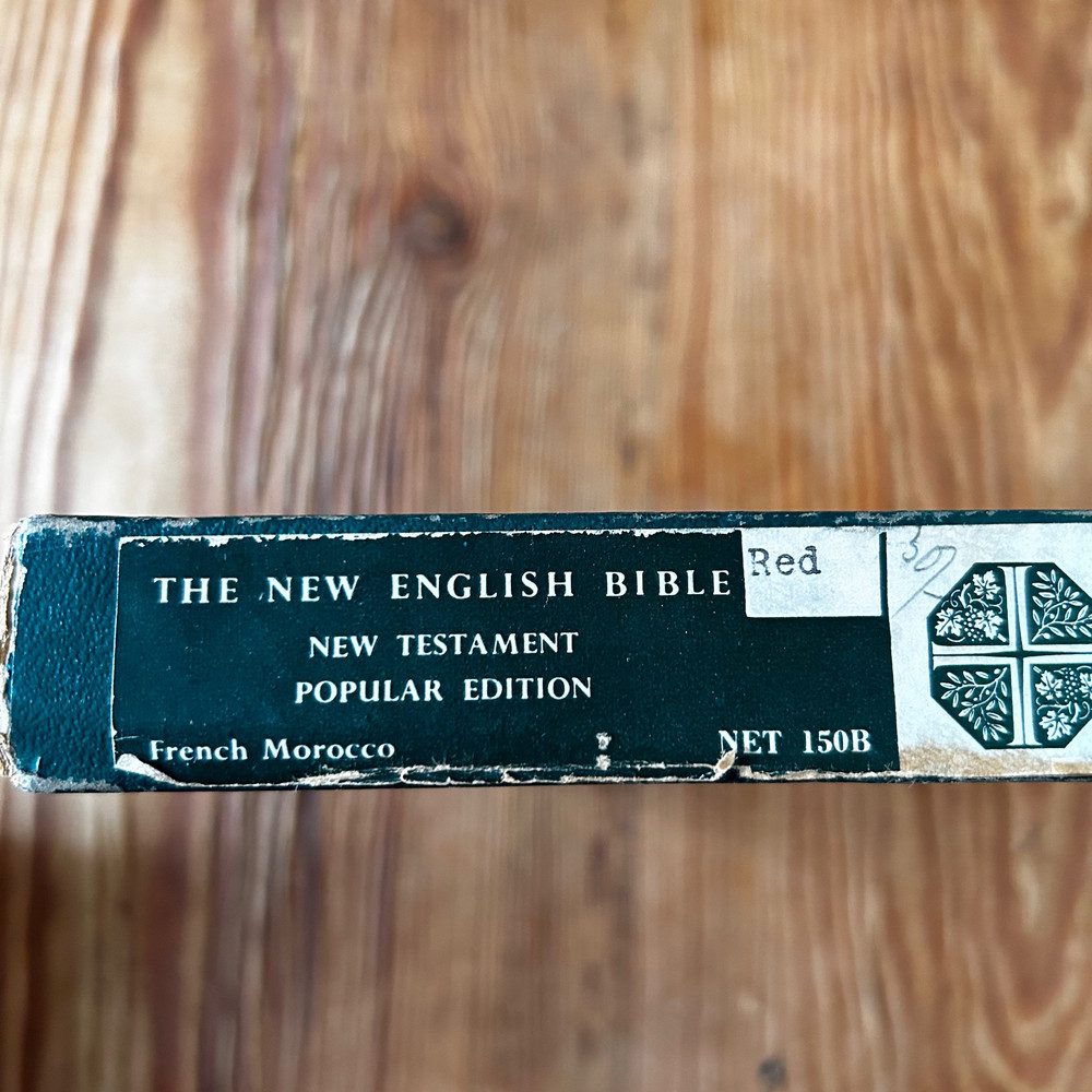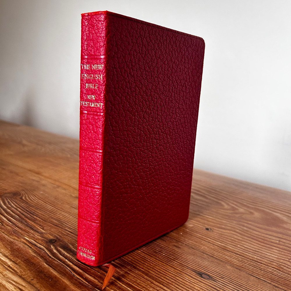 Here we have a lovely New English Bible containing the New Testament. Published by Oxford and Cambridge University Press c1961 and is the popular edition. It has red French Morocco covers and has a ribboned bookmark and comes in its original slip case. The bible is in a good condition and look hardly used. The pages are gilt edged. Slight foxing to the very page edges on the last few pages.
